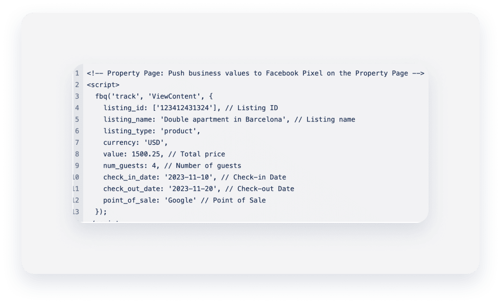 This event tracks the number of visitors browsing a specific property page. When a visitor enters a property page, the event is automatically sent to Google Analytics as long as the check-in and check-out dates and the minimum number of guests are specified (see the example below).