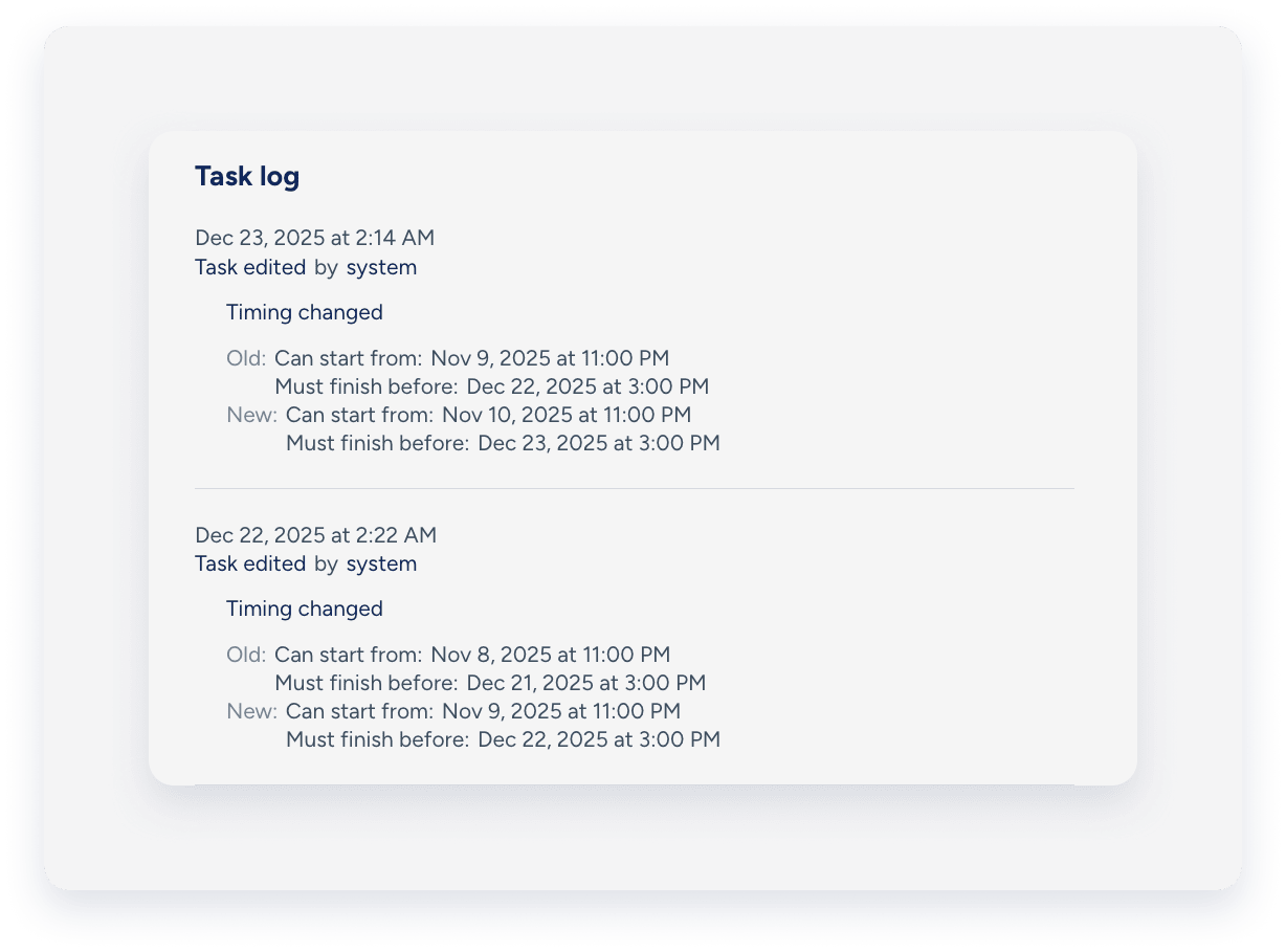 Task logs display different labels depending on how the task was managed. Review the scenarios below to understand the log entries:
