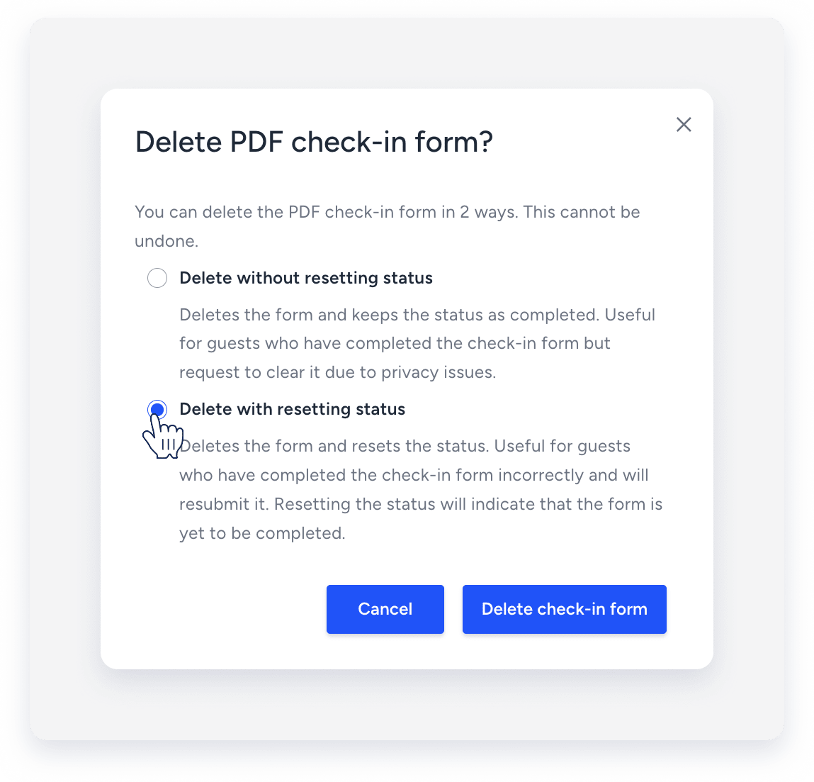 To allow the guest to resubmit their information, reset the status while deleting. The PDF status reverts from "Completed" to "Sent".