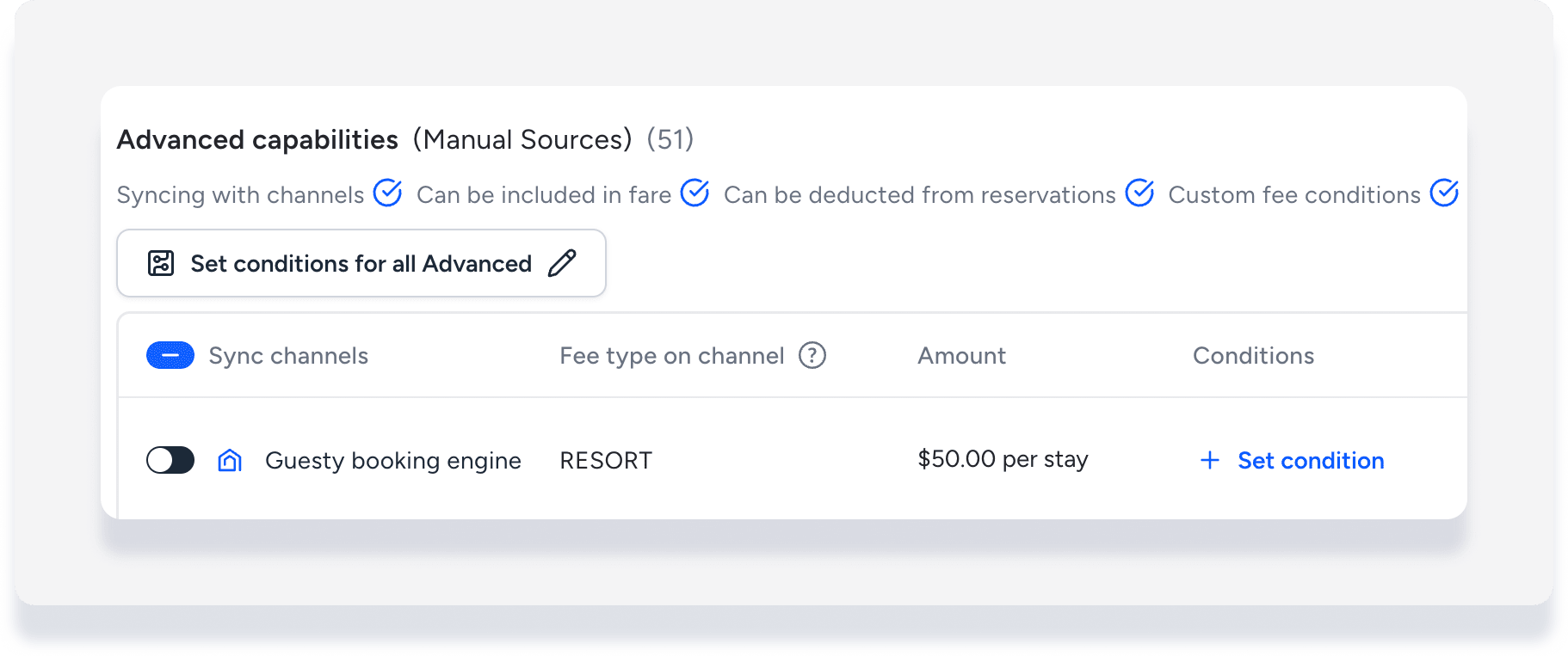 If you offer a fee as an upsell, toggle off Sync fee for the Booking Engine. This prevents the fee from being added twice to a reservation—once automatically and once as an optional upsell.