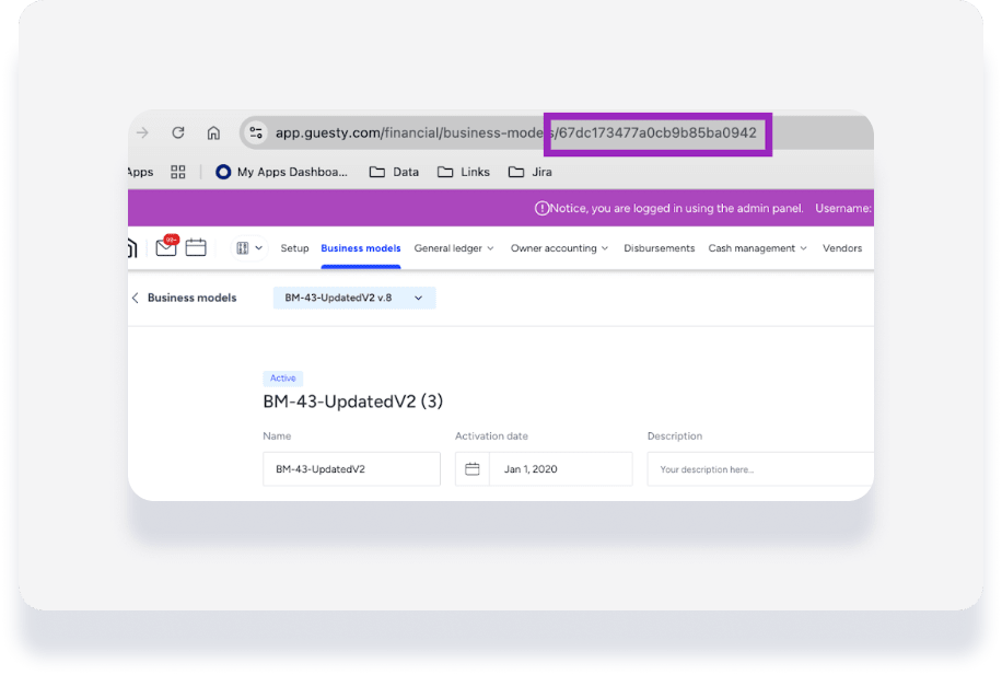 You can find the Business Model ID by navigating to Accounting > Business model. Click on the relevant business model, and copy the ID from the URL as highlighted in the image below.