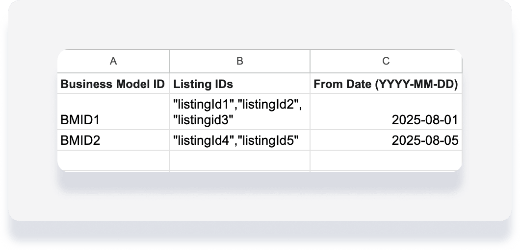 How to fill in: Enter all listings for the same business model in one cell. Start and end each listing ID with quotation marks, and separate listings with a comma. Example: "listingId1","listingId2","listingId3"