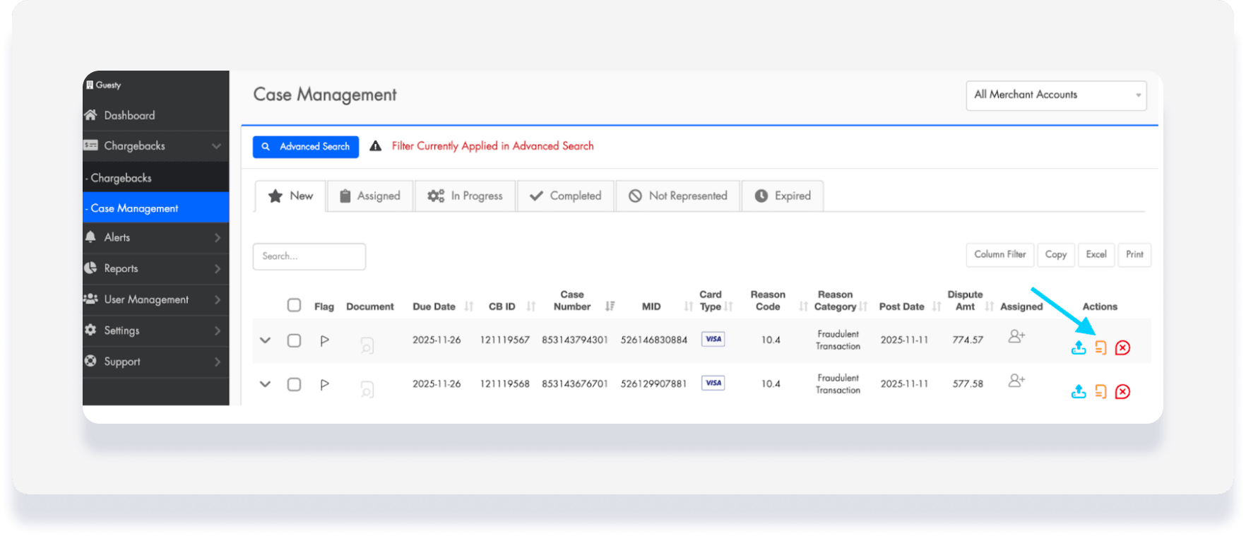 The dispute dashboard provides a centralized view of all current and past chargebacks. Use the Case Management tab to monitor your progress and take action on new disputes.