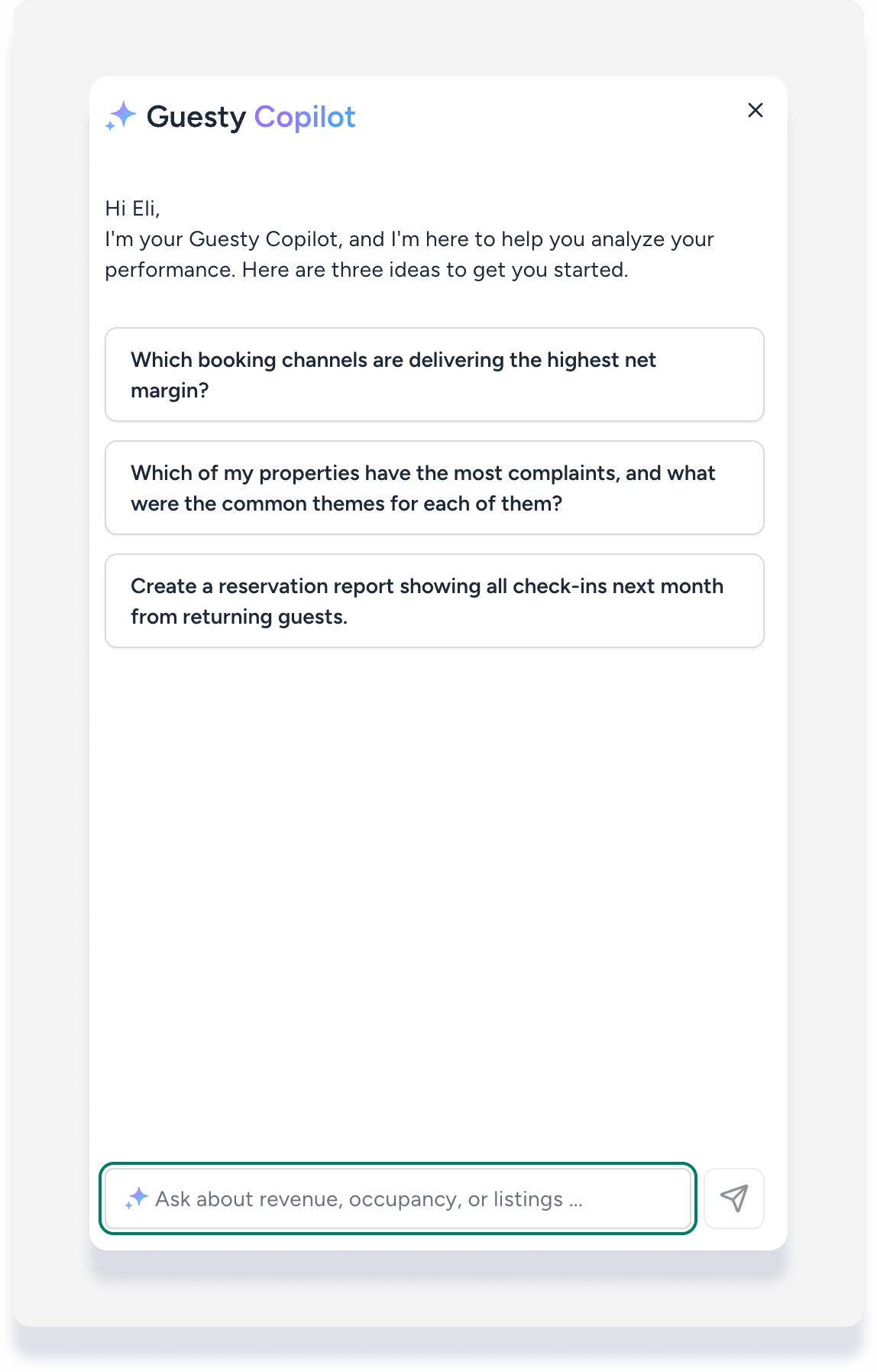 When you open the side panel, Guesty Copilot greets you by name and offers suggested questions to help you get started. You can click a suggestion or type your own question in the chat field at the bottom of the panel.