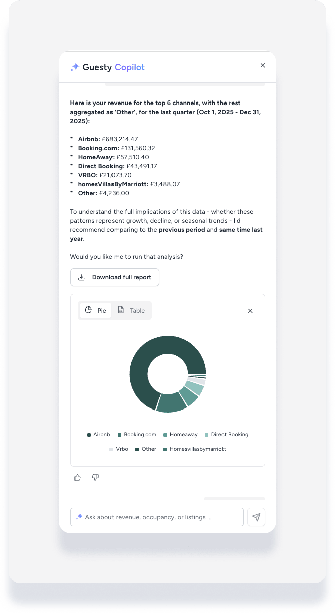 Guesty Copilot is an AI-powered analytics assistant designed to help you understand your business performance through natural language. Instead of manually building reports or exporting spreadsheets, you can ask questions in plain English to get instant insights, downloadable reports, and interactive visualizations.
