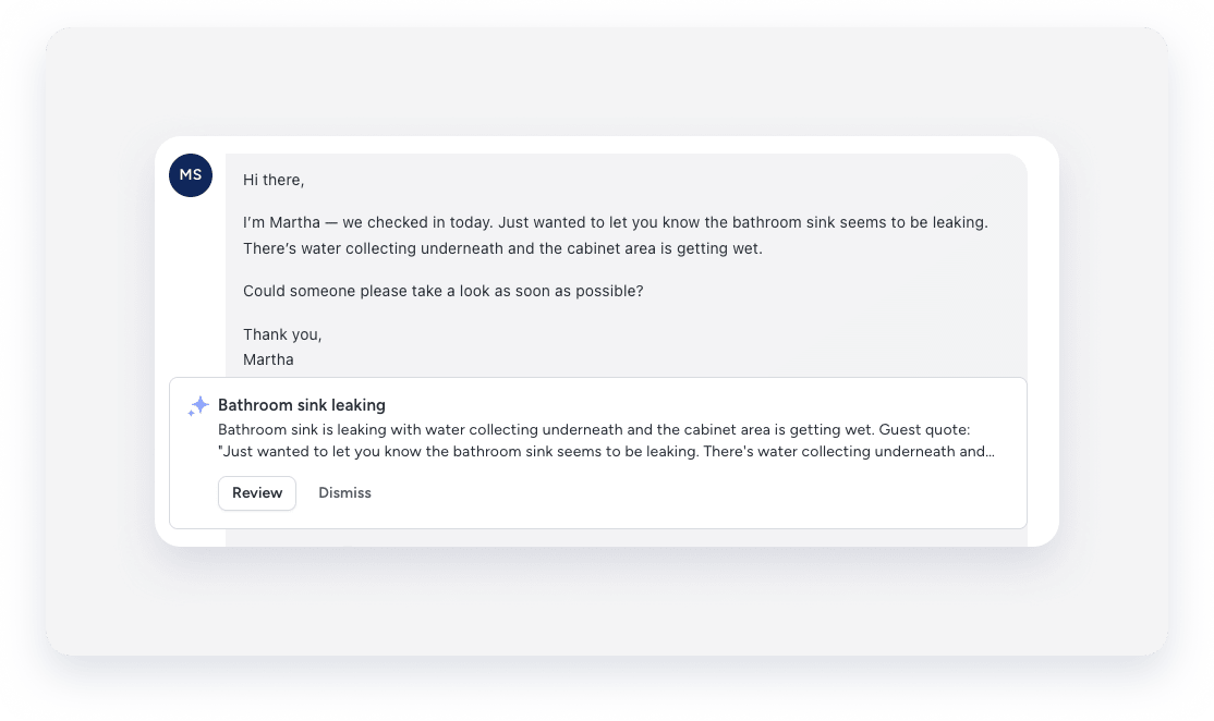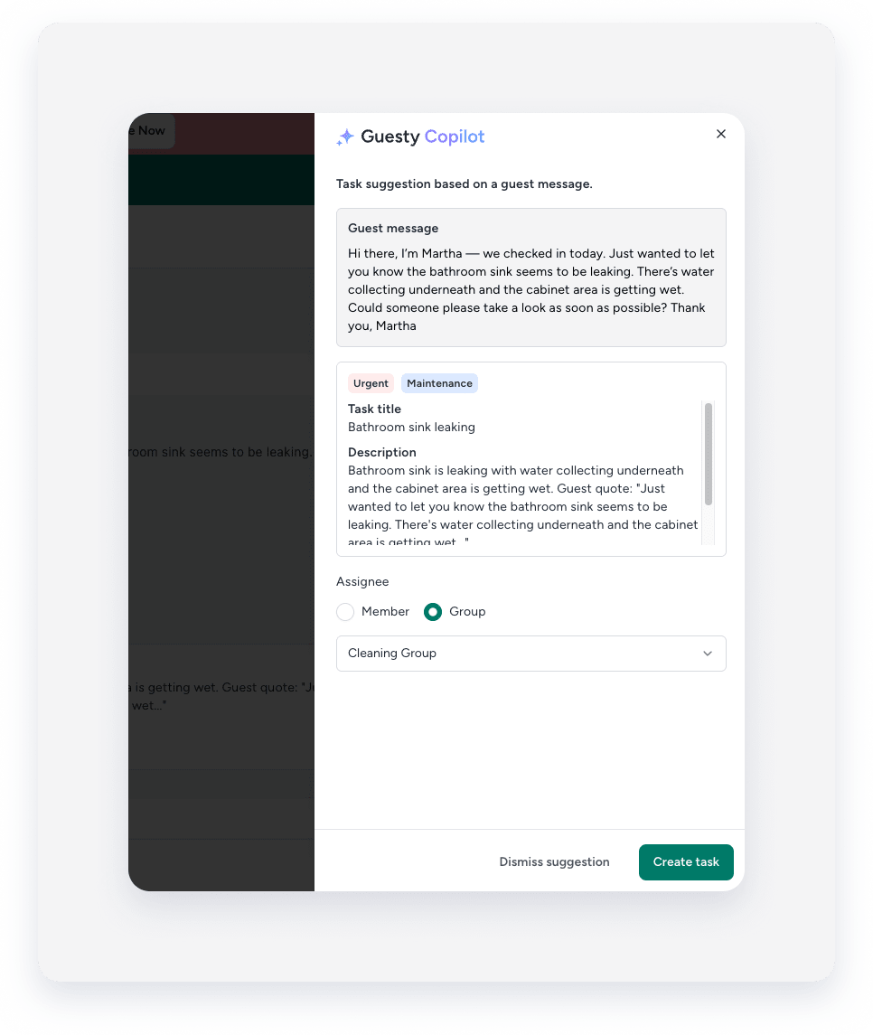 AI Task Suggestions, powered by Guesty Copilot, automatically analyzes incoming guest messages in the Guesty Inbox. When the AI detects an actionable request, such as a maintenance issue or a cleaning request, Guesty Copilot generates a pre-filled task suggestion directly in the conversation thread.