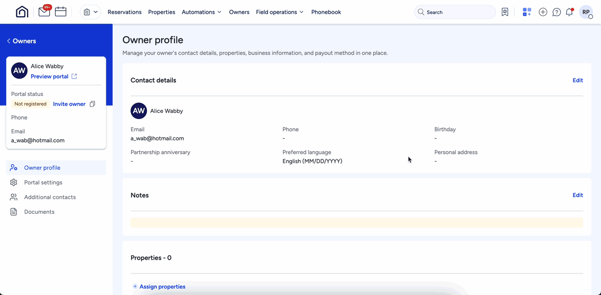 - At least one property needs to be assigned to an owner. If an owner only has one property assigned, and you want to unassign it, you will need to assign a different property to the owner before proceeding. Alternatively, you can delete the owner.