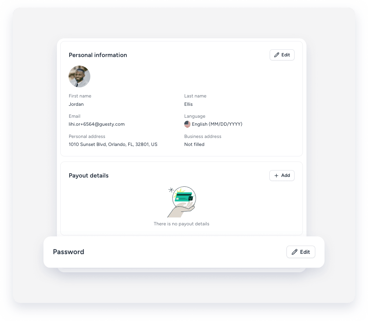 Esto también aplica si un usuario de Guesty y un propietario comparten una dirección de correo electrónico. Usar la misma dirección de correo electrónico para ambos, Guesty y propietario, puede causar problemas, como que el restablecimiento de la contraseña del propietario active el restablecimiento de la del usuario de Guesty.