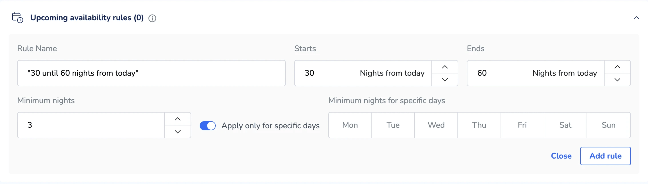 Las reglas de disponibilidad para próximas estancias te ayudan a garantizar que tu calendario esté lleno de estancias más largas con antelación, definiendo un mínimo de noches para periodos específicos. Por ejemplo, suponga que quiere crear una regla que se aplique a partir de hoy treinta noches y finalice a partir de hoy sesenta noches, y que solo aplique a días específicos. Ajuste estos requisitos en la sección "Reglas de disponibilidad para próximas disponibilidades". Estas reglas se añaden a las reglas basadas en tiempo.