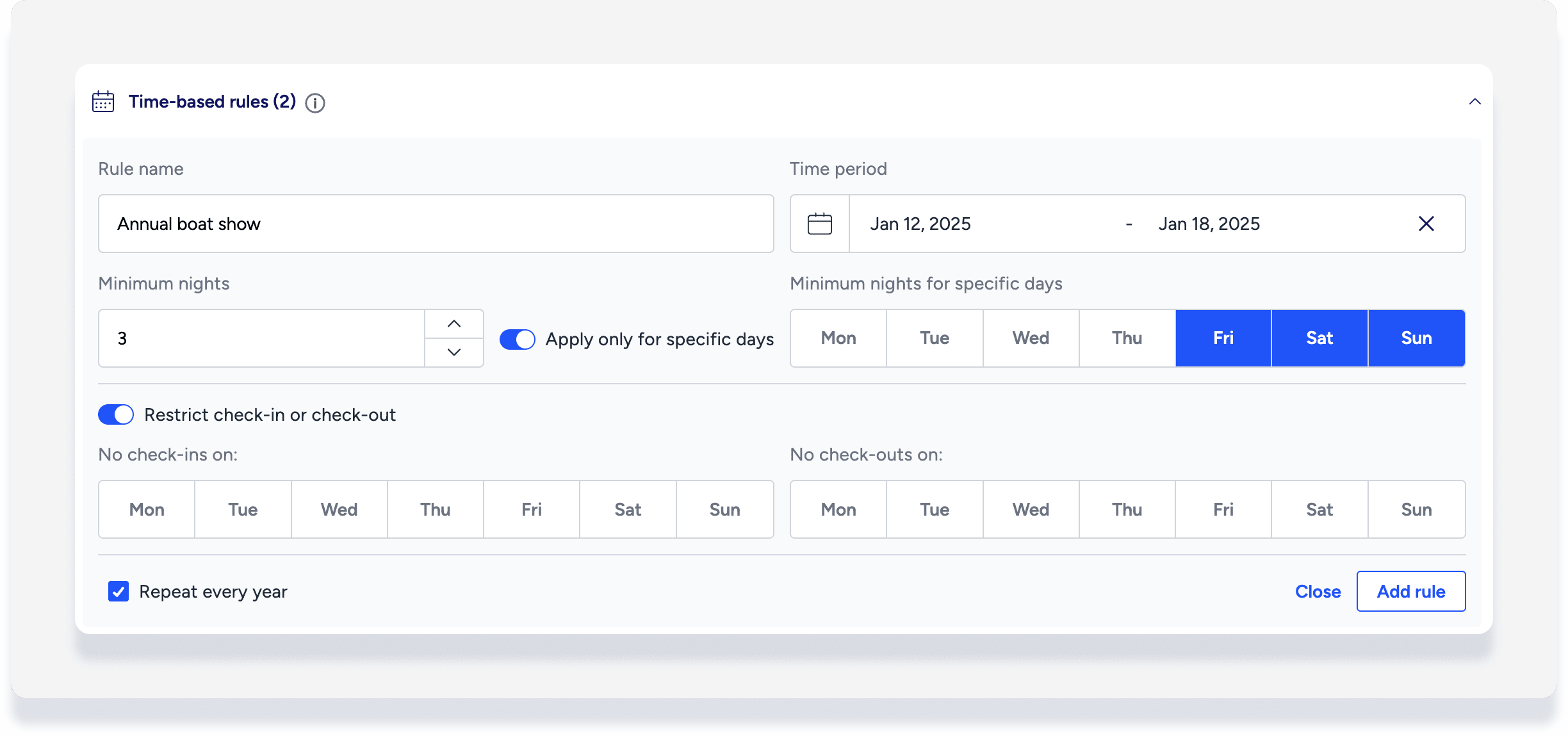 En la sección Reglas basadas en tiempo, puede ajustar los requisitos de estadía mínima para reservas dentro de un período de tiempo específico, como días festivos, eventos o temporadas.