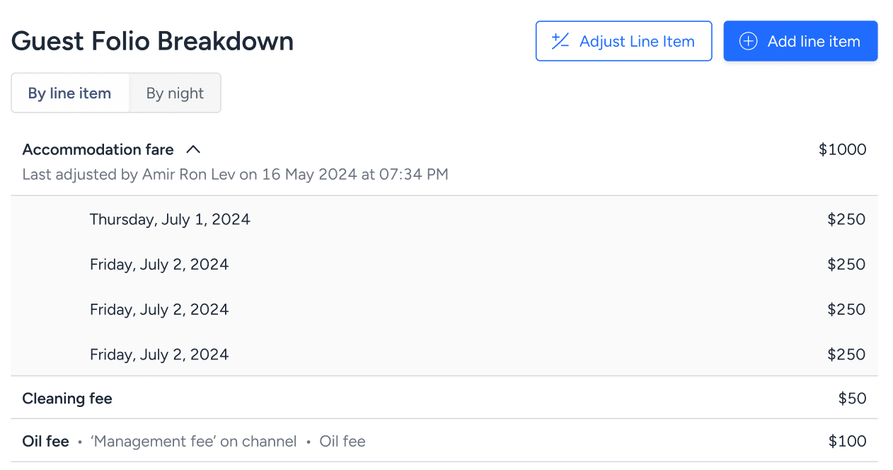 En el ejemplo anterior, al realizar la reserva en el canal, el huésped vio una "Comisión de gestión" de $200. En Guesty, esta "Comisión de gestión" se asigna a dos tipos de comisiones diferentes. Ambas se muestran en el folio del huésped, con el importe total dividido entre ellas.