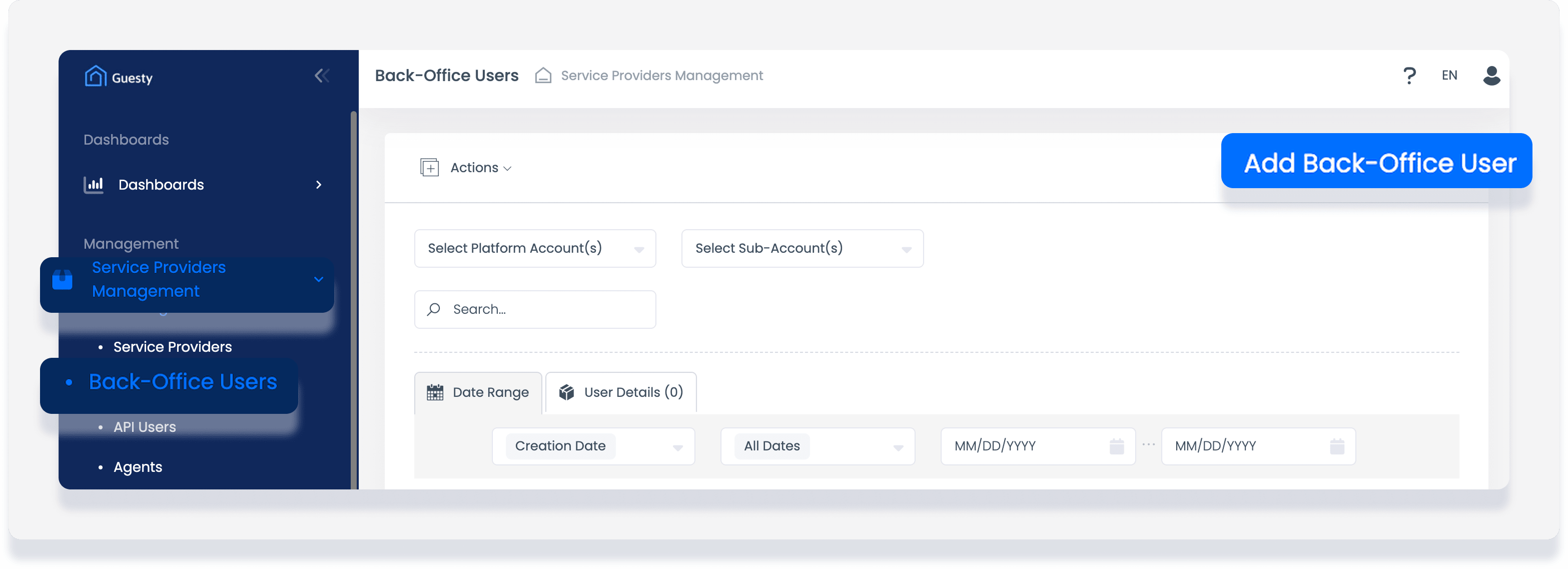 Si necesita dar acceso a su panel de GuestyPay a más miembros de su equipo, cree un nuevo usuario de back-office directamente en su cuenta. Siga los pasos a continuación para configurar un nuevo usuario.