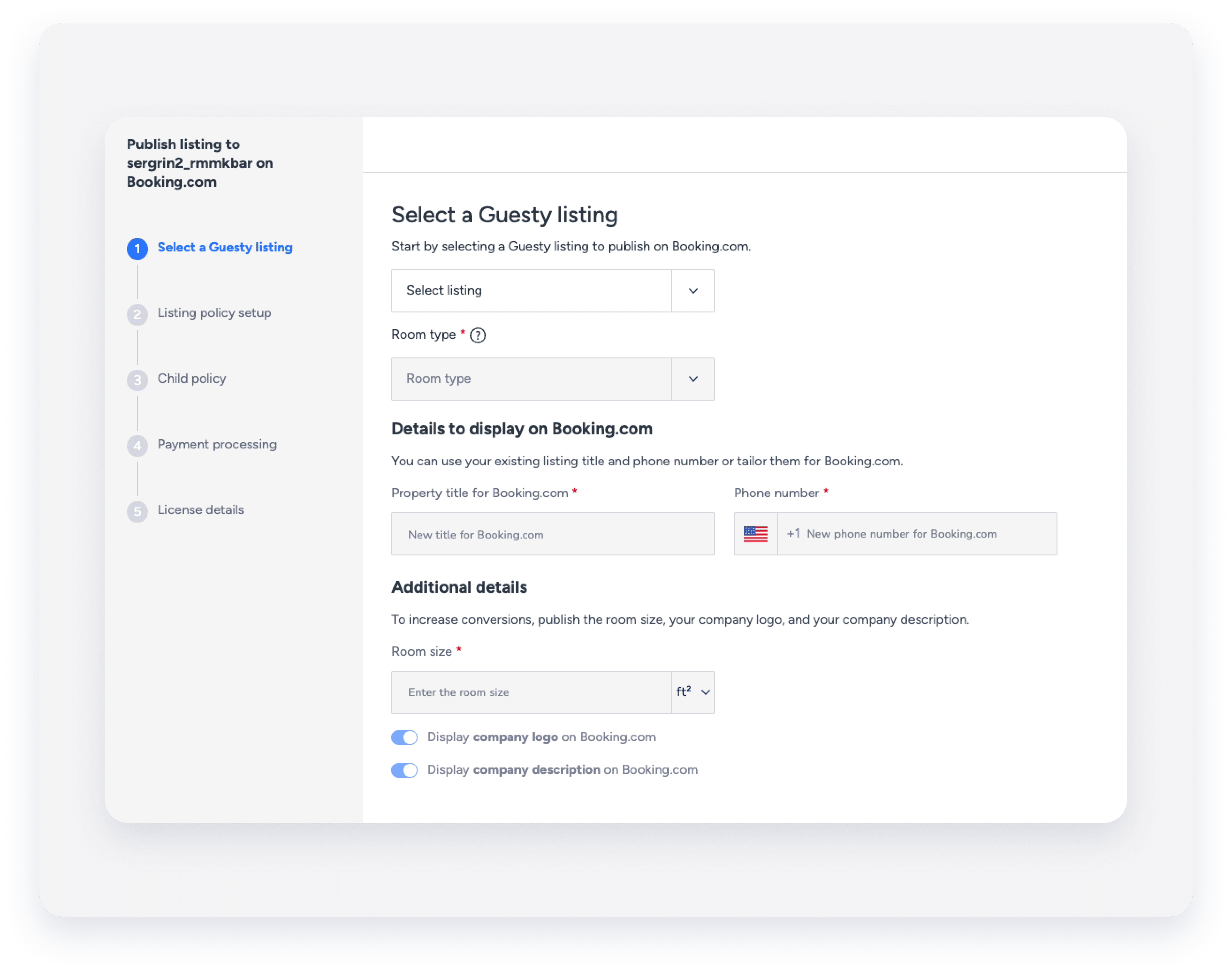 - Publica tus anuncios de Guesty en Booking.com. Crea un anuncio nuevo o utiliza un anuncio existente en Guesty y agrégalo a tu cuenta de Booking.com.