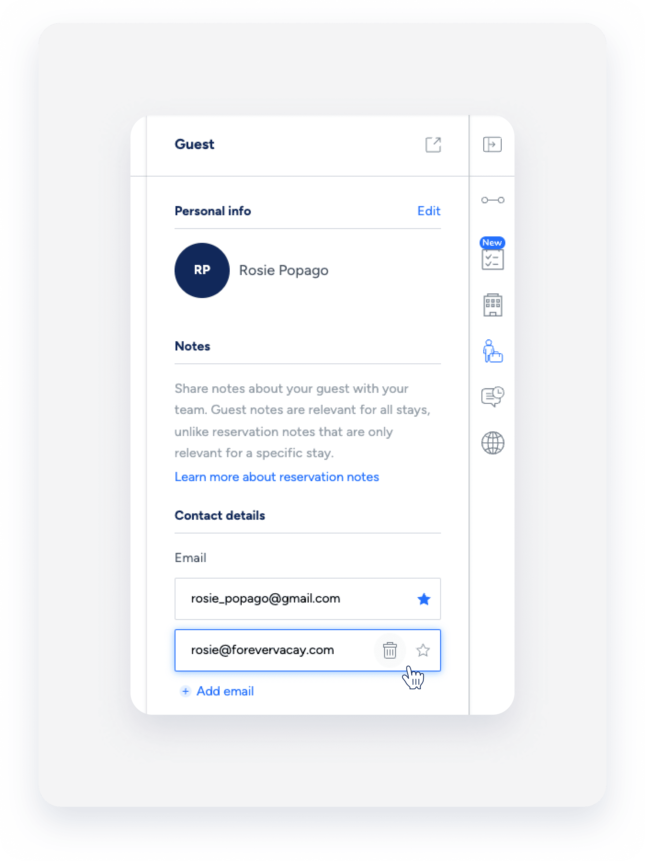 Cuando un huésped realiza una Reserva, sus datos de contacto se guardan automáticamente en Guesty. Si una Reserva tiene más de una dirección de correo electrónico guardada en Guesty, puede elegir qué dirección se utilizará para la comunicación con el huésped estableciéndola como el correo electrónico principal. La dirección principal se indica con una estrella azul junto a ella.