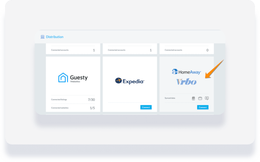 La vignette Vrbo sur la page de distribution apparaît grisée avec un bouton « Connecter », indiquant que la procédure de connexion n'a pas été lancée. Par conséquent, la page d’intégration reste vide.