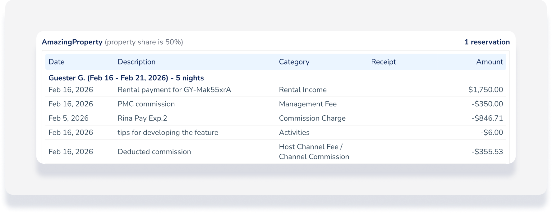 Une réservation par le propriétaire ou d'un propriétaire et son invité peut être répartie sur plusieurs relevés de propriétaire. Par exemple, une réservation du 28 janvier au 2 février apparaîtra sur le relevé du propriétaire de janvier (pour la période du 28 au 31 janvier) et sur celui de février (pour la période du 1er au 2 février). La valeur des réservations du propriétaire étant toujours nulle, cela n'a aucune incidence sur le solde des relevés.