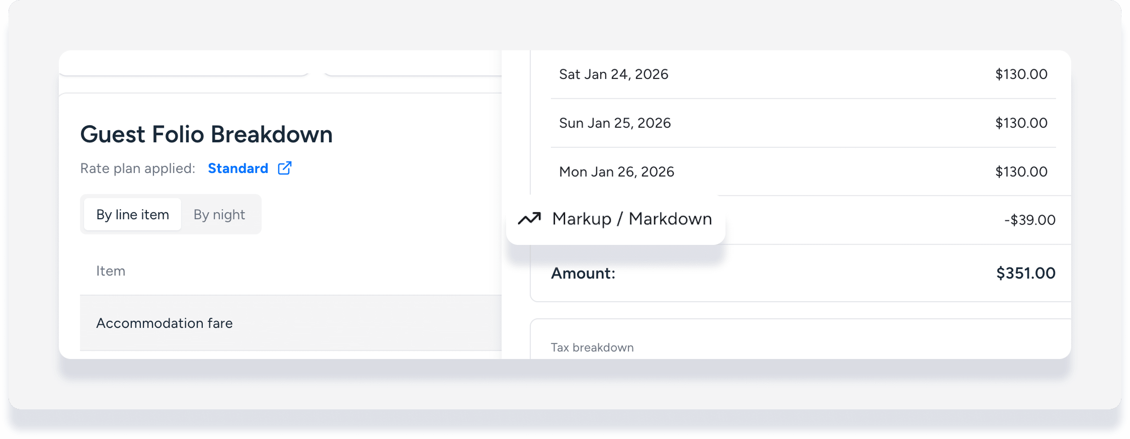 Realice un seguimiento de los ingresos de margen a través de sus informes contables. Estos datos proporcionan un registro de auditoría completo, lo que le permite comparar las finanzas de las reservas con su configuración de tarifas sin necesidad de realizar correcciones manualmente.