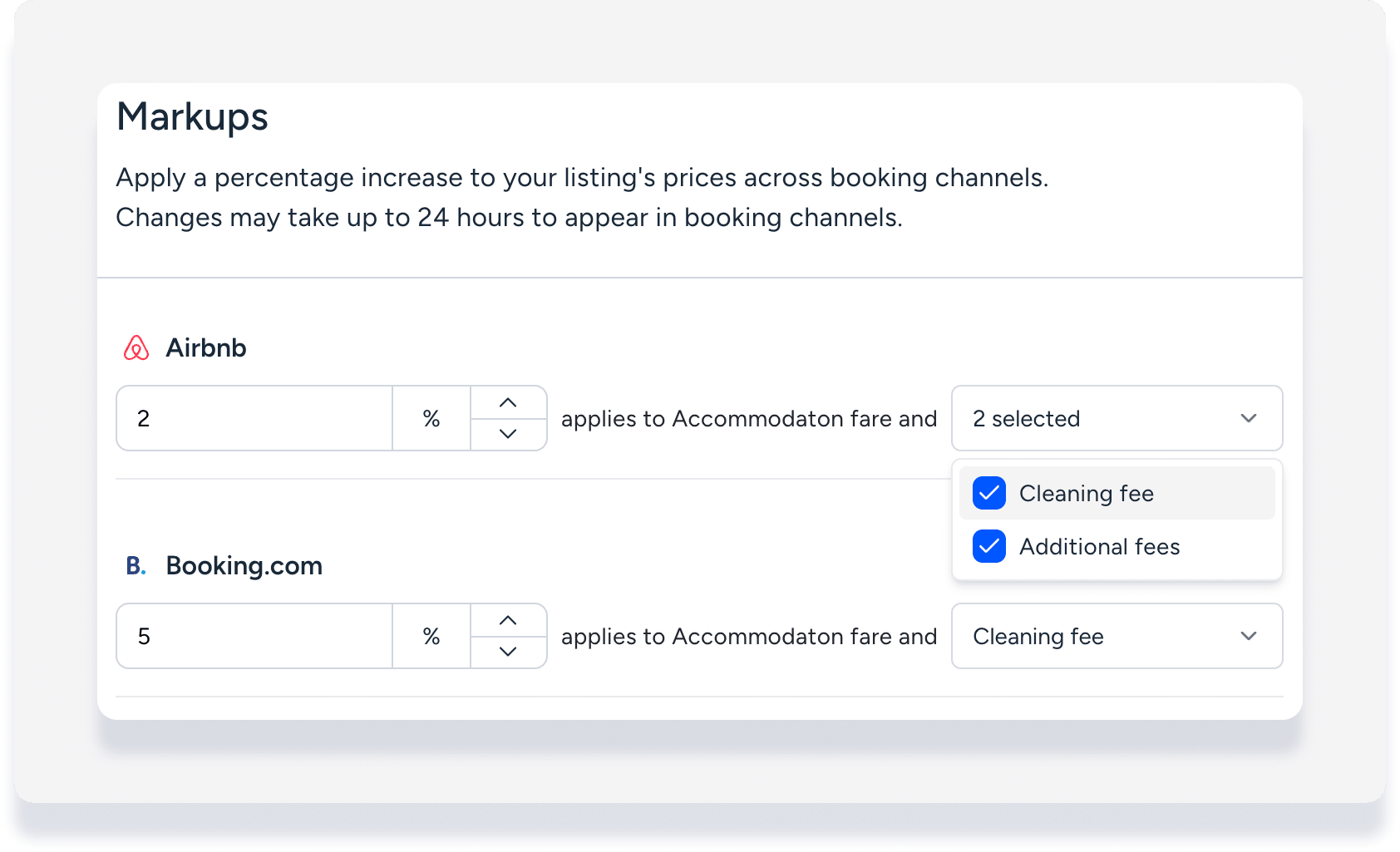 Appliquez une marge bénéficiaire aux frais de ménage et aux frais supplémentaires, en plus du tarif d'hébergement, pour Airbnb et Booking.com. Cela correspond à la structure tarifaire unique d'Airbnb. Guesty fournit un détail clair des majorations appliquées aux frais, vous permettant ainsi de contrôler vos marges et de tenir une comptabilité précise pour les réservations Airbnb.