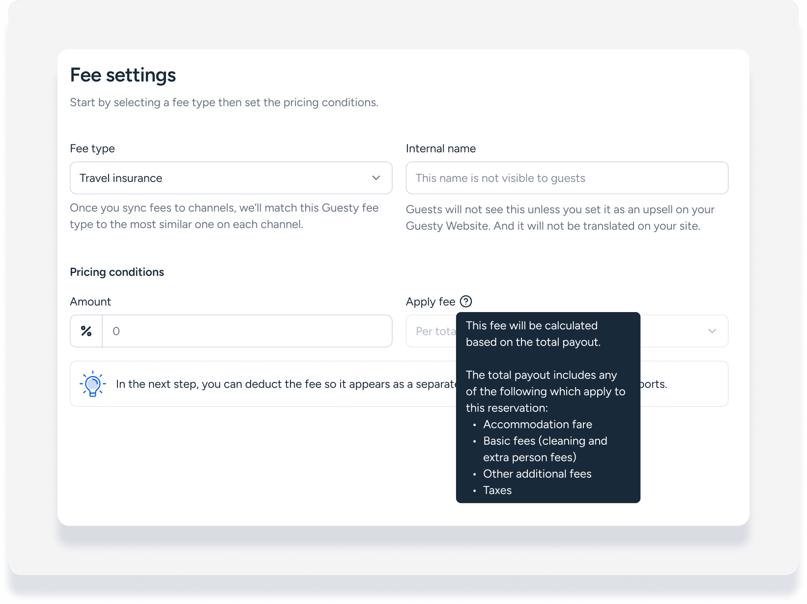 Lorsque vous créez des frais supplémentaires, les pourcentages sont généralement calculés sur la base du tarif d'hébergement, des frais de ménage, ou des deux. Guesty propose actuellement une nouvelle option pilote permettant de créer un type de frais calculé sur le montant total du paiement.
