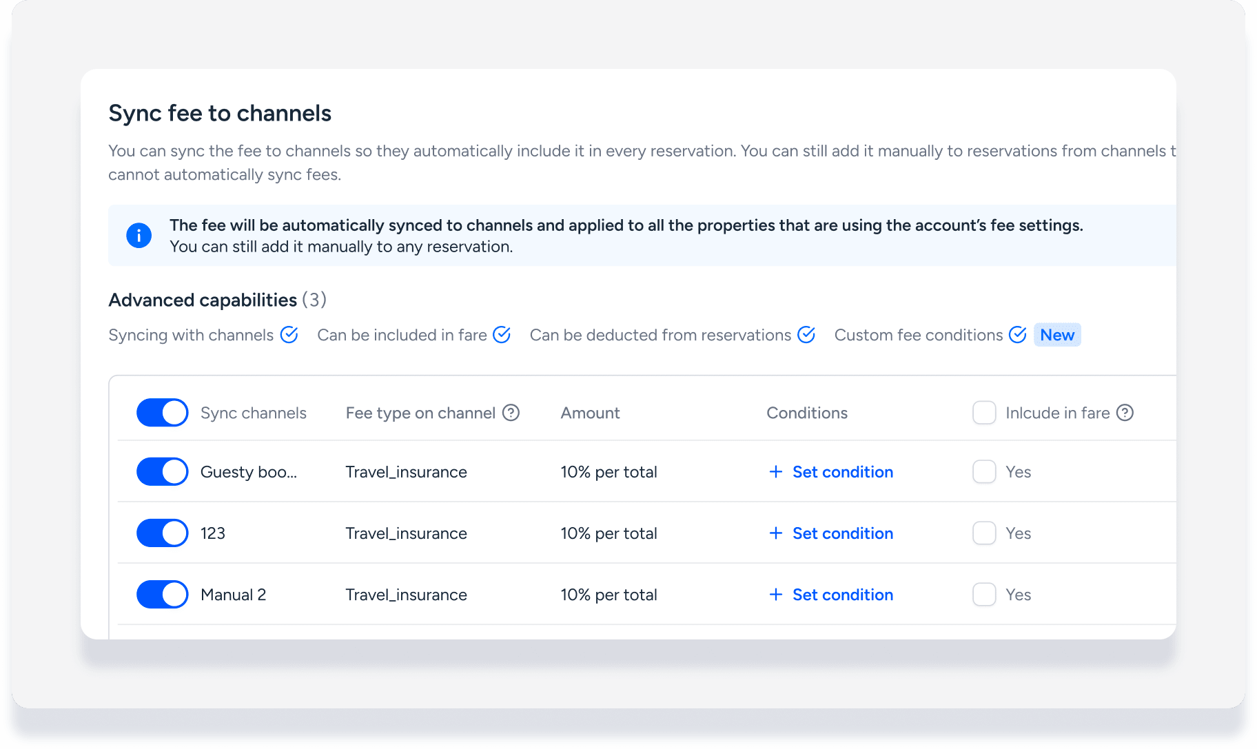 Synchronisez les frais avec vos canaux de réservation directe pour qu'ils soient automatiquement inclus dans chaque nouvelle réservation. Vous pouvez consulter le type de frais affiché aux voyageurs sur chaque canal et le modifier si nécessaire.