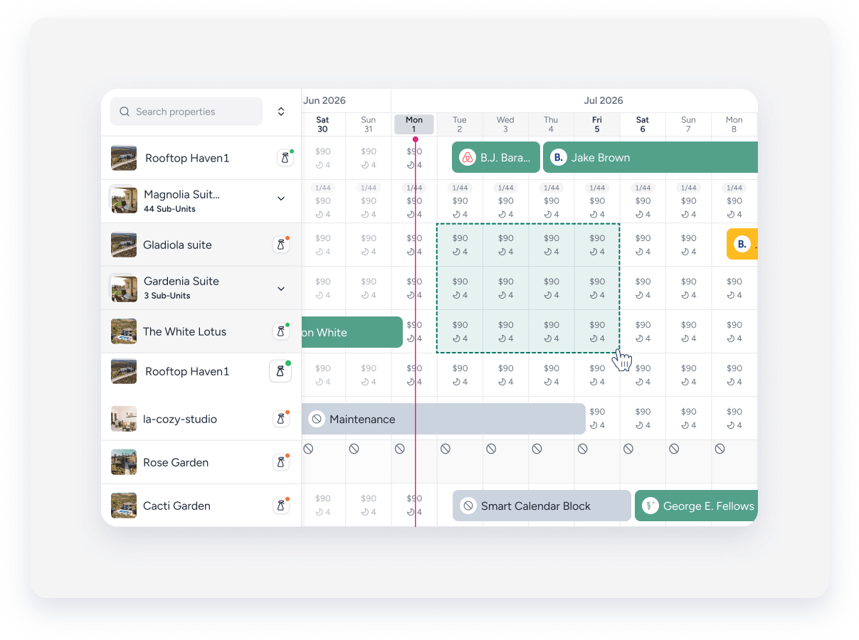 Effectuez des actions groupées sur le Calendrier multiple pour gagner du temps lors de la mise à jour de plusieurs propriétés et plages de date. Appliquez simultanément des modifications à différentes cellules afin de réduire les tâches manuelles répétitives et de gérer la disponibilité de plusieurs propriétés à la fois.