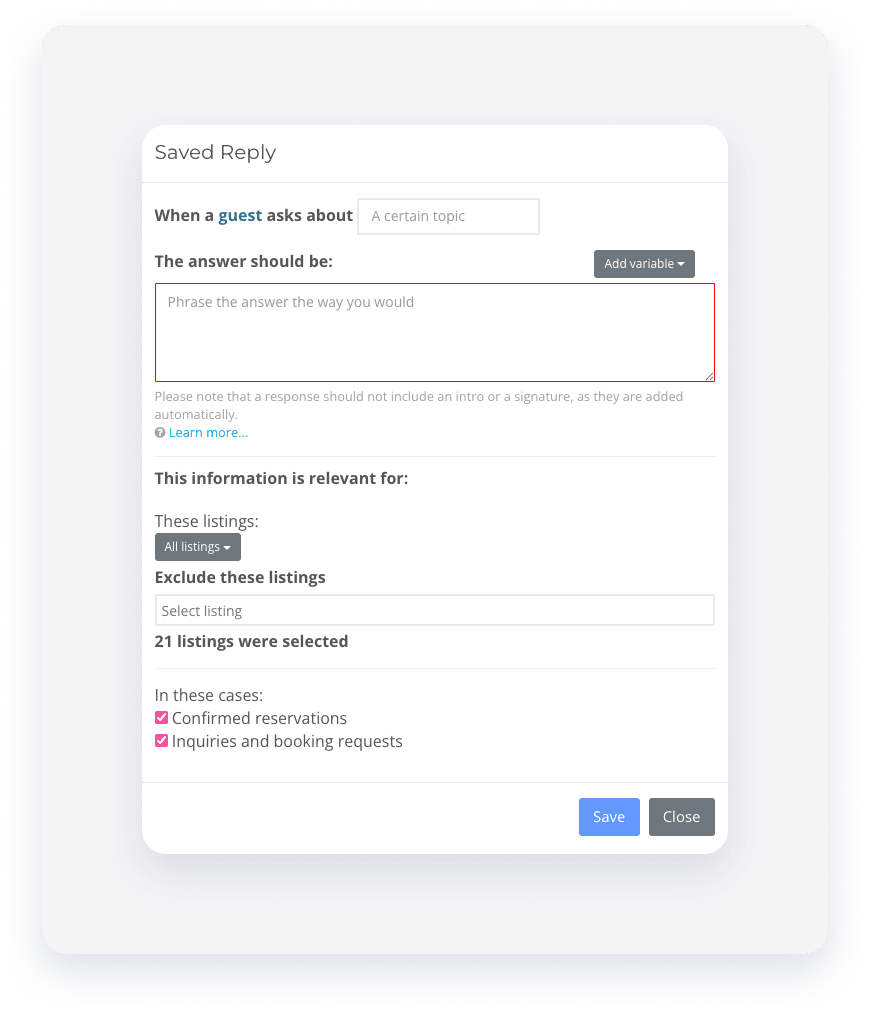 Créez des réponses personnalisées pour voyageurs en y ajoutant des variables. La procédure est identique à celle utilisée pour ajouter des variables aux messages automatisés.