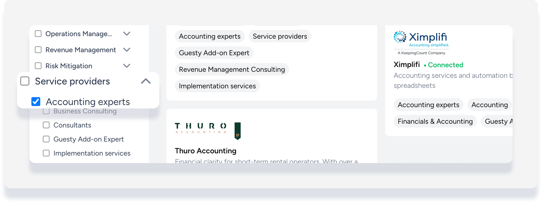 Thuro Accounting, Ximplifi e HostAllies sono fornitori di servizi qualificati e formati che possono aiutarti a configurare Accounting by Guesty e a sfruttarne appieno tutte le potenzialità per la tua attività.